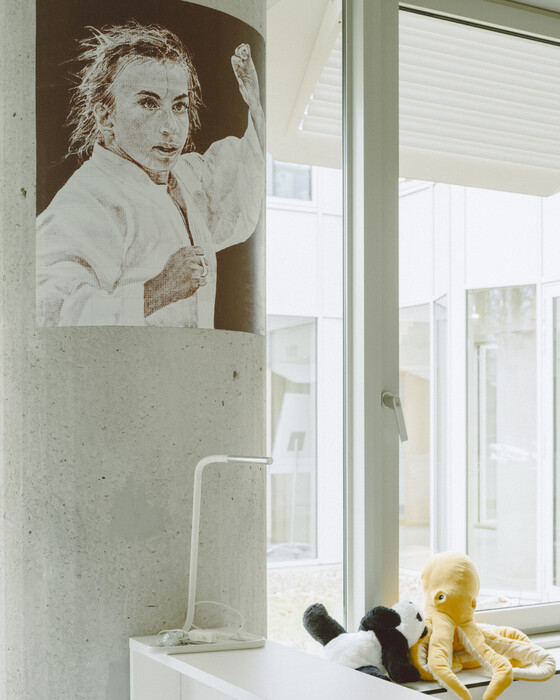 Dans les chambres du bâtiment, des portraits monochromes de sportives et sportifs belges francophones médaillés fixent l’intensité du mouvement tout en invitant au calme et à la réflexion. Reproduites sur une fibre de verre appliquée directement sur les colonnes de béton, ces images laissent apparaître la trame du support, offrant une matière vibrante où la peinture se mêle à l’architecture.